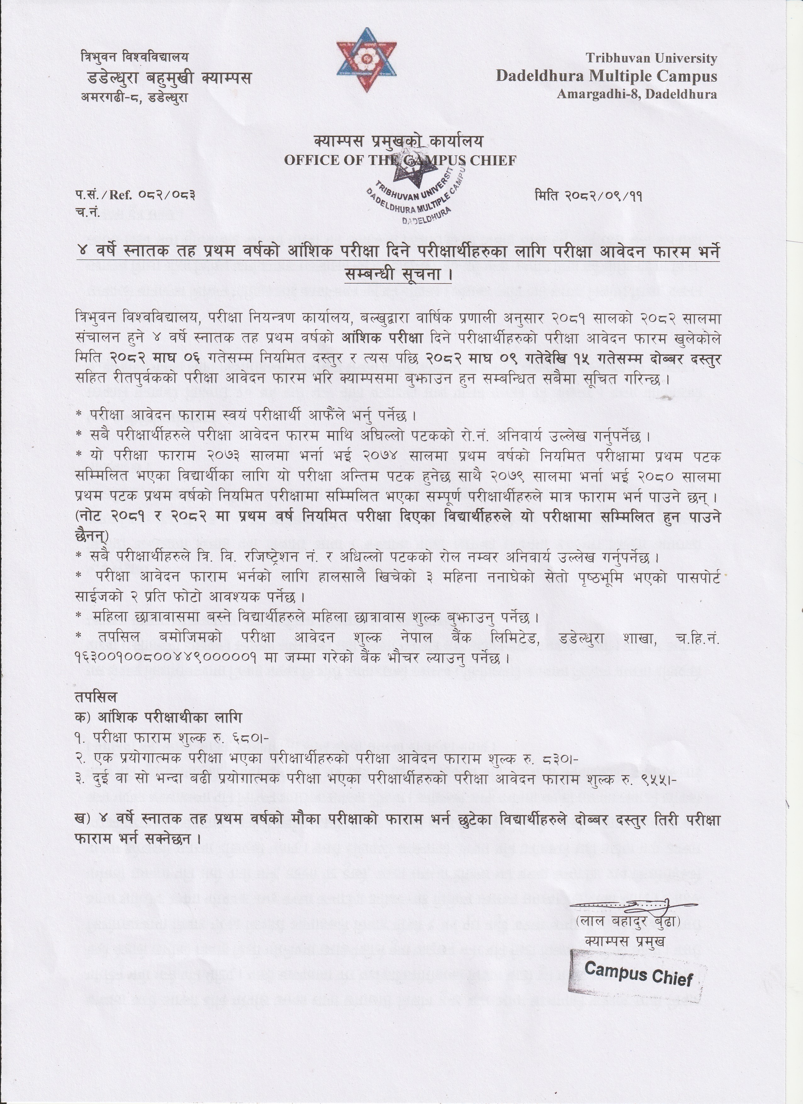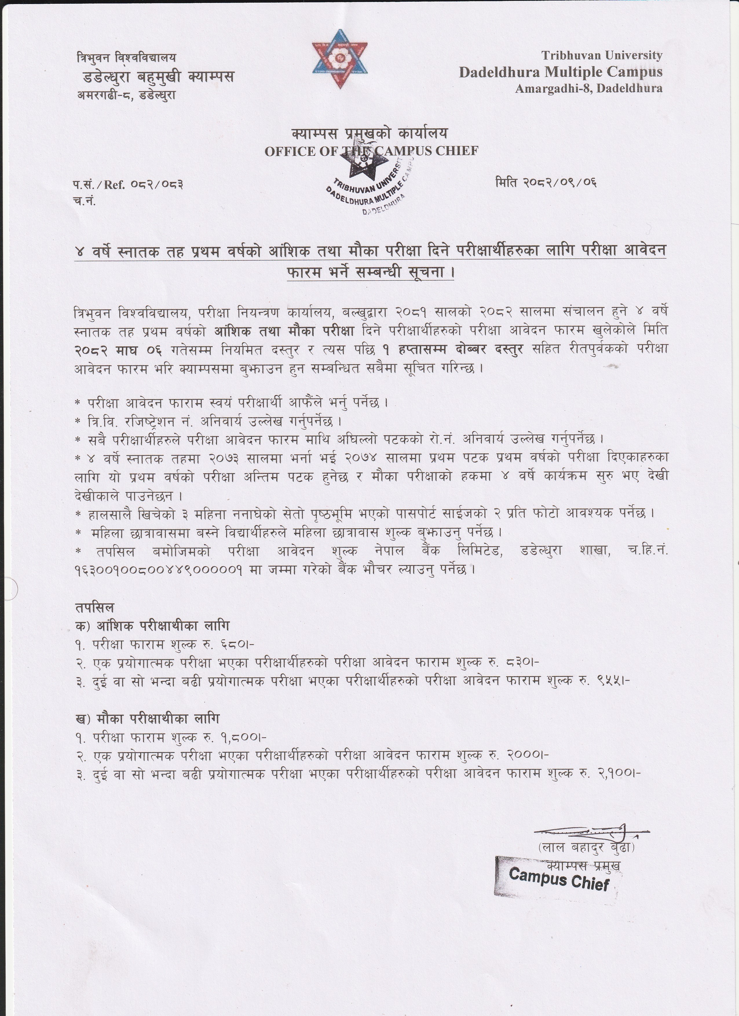 ४ वर्षे स्नातक तह प्रथम वर्षको आंशिक परीक्षा दिने परीक्षार्थीहरुका लागि परीक्षा आवेदन फारम भर्ने सम्बन्धी सूचना