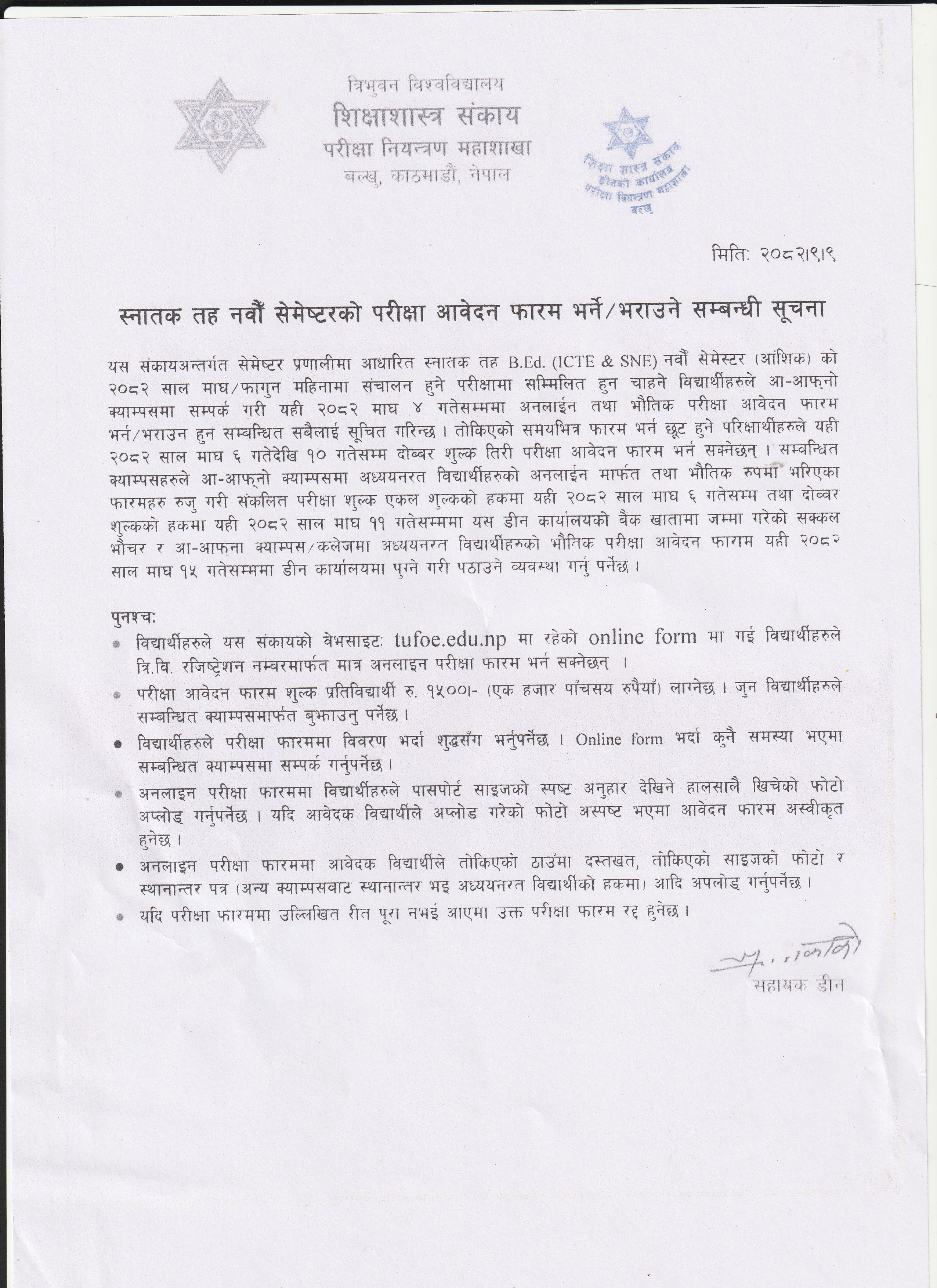 स्नातक तह नवौँ सेमेस्टरको परीक्षा फाराम भर्ने सम्बन्धी सूचना ।