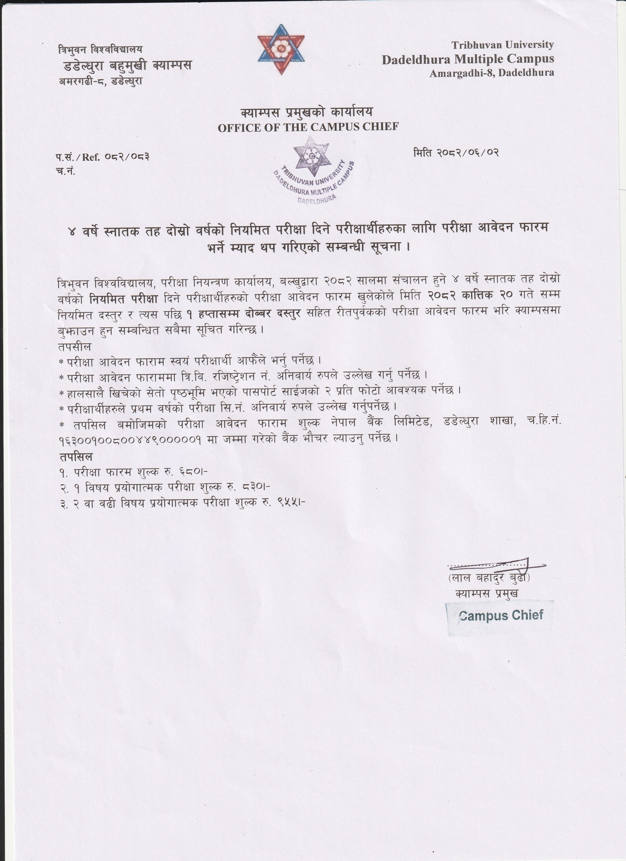 ४ वर्षे स्नातक तह दोस्रो वर्षको नियमित परीक्षा दिने परीक्षाथीहरुको लागि परीक्षा आवेदन फारम भर्ने म्याद थप गरिएको सम्बन्धी सूचना