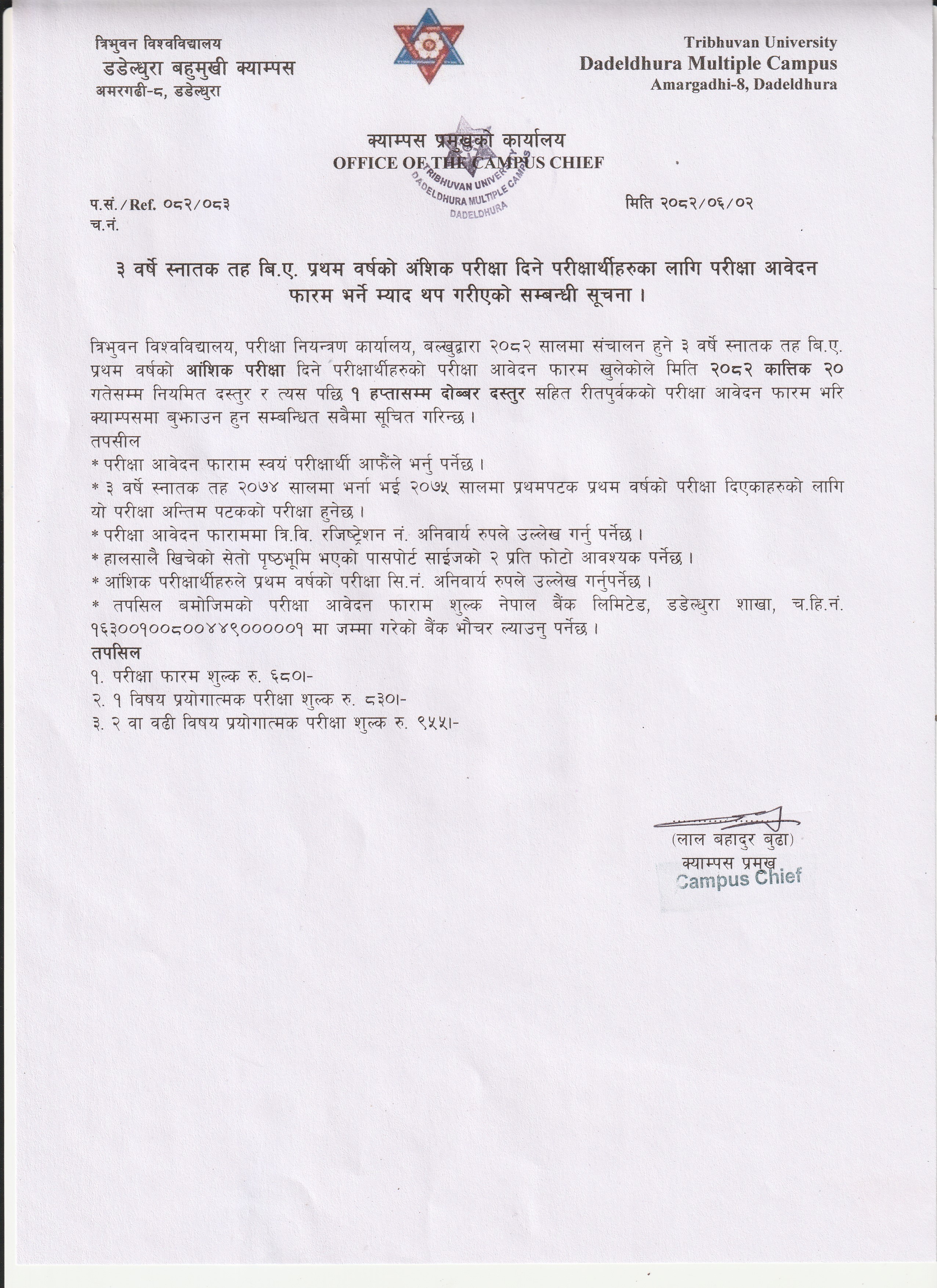 ३ वर्षे स्नातक तह बि।ए।प्रथम वर्षको आंशिक परीक्षा दिने परीक्षाथीहरुका लागि परीक्षा आवेदन फारम भर्ने म्याद थप गरिएको सम्बन्धी सूचना